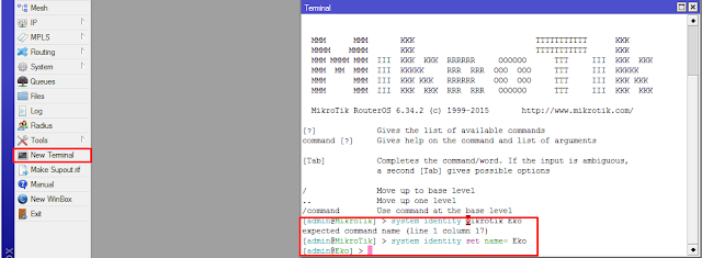 1. Pertama seperti biasa kita hubungkan dulu mikrotik kita dengan internet di ether 1 dan di ether 2 kita hubungkan dengan pc yang akan mensetting mikrotik. jika sudah kita buka menggunakan winbox lalu pilih new terminal jika sudah maka kita akan mulai mensettingnya.